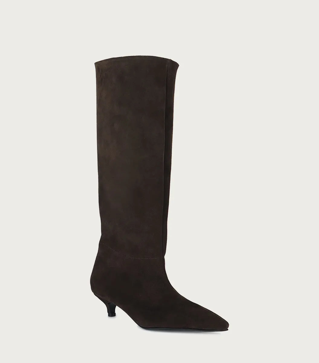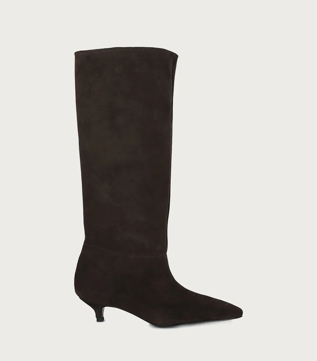 Bota Lake chocolate en gamuzón, con diseño en punta y calce directo para máxima comodidad. Forrada en fibras animal friendly, cuenta con un taco bajo de 3,5 cm forrado en el mismo material. La circunferencia de la caña mide 40cm en el talle 36.